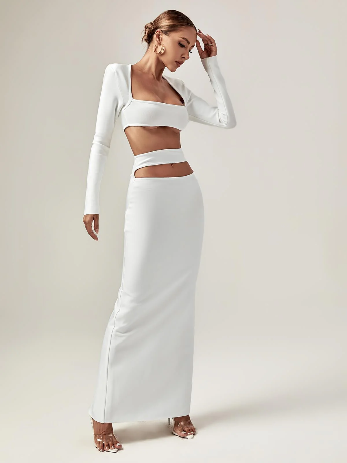 A sexy cutout detailing that lends you an alluring look. This Kynlee Cutout Bandage Set keeps a perfect balance between sophisticated and playful. Made of high quality knit, this set also has a sexy cut-outs accented at the chest and the waist, a long sleeve styling, a floor-length hem. Pair it with strappy heels and a matching clutch to make a statement!